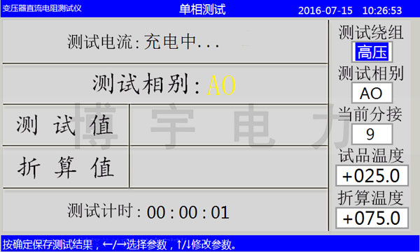 ② 在图四中当选中并执行“单相测试”菜单后,采用单通道方式对单相绕组的电阻进行测试,显示如图七。